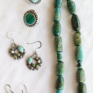 Ornate sterling Barse hoop earrings inlaid with cabochon gemstones or glass and hung on French wires. Pair weighs 10 grams and measure about 35mm x 20mm.