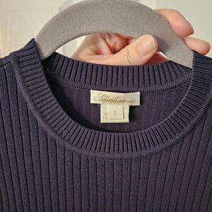 Stylish dark navy dress with short sleeves. Features a ribbed top and faux leather skirt with a belt detail. Never worn