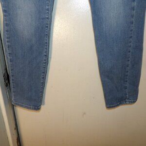 light blue wash , 5 pocket style with belt loops , skinny leg , material is 84% Cotton 15% Polyester 1% Spandex , Sz 29 rise measures 9" Inseam measures 25.5 " ( ankle or crop skinny ) Waist Lying flat measures 14.5" , decent wearable used condition no holes stains or distressing shows moderate washing wear. Pet friendly non smoking home