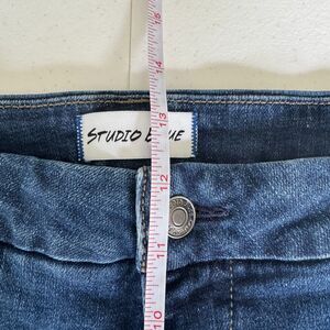 These Studio Blue Straight Leg High Rise Jeans in a medium wash are a versatile addition to any woman's wardrobe. Made of cotton denim, these jeans feature a zip and button closure, with a high rise waist for a flattering fit. The solid blue color and straight leg style make them perfect for all seasons, while the regular fit and 27.5-inch inseam offer comfort and style. Machine washable and in brand new without tags condition, these jeans are a stylish choice for everyday wear.