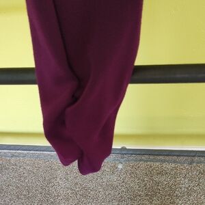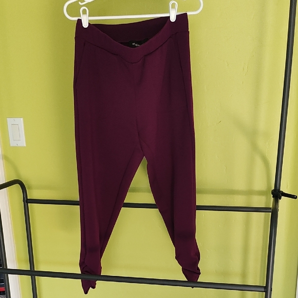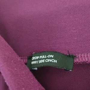 Luscious raspberry color; soft and comfortable material. Pull-on style with pockets and ruching at the ankles. Super cute! Inseam about 26 inches.
