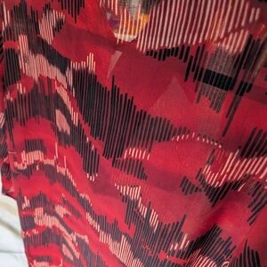 AC17. Studio C Plus 16W Abstract Long Tunic, Shirt, Blouse, Button Front Red, Black & Cream lines. Front darts. Would need a cami under as it is a little sheer.