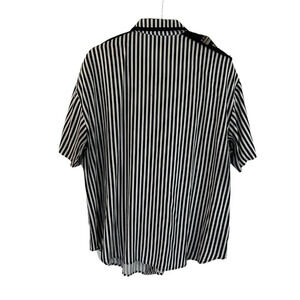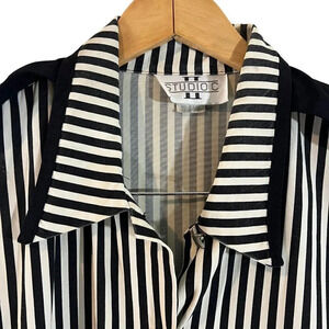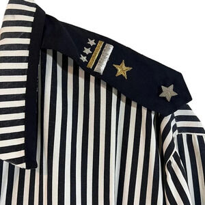This Studio C button-up shirt is a vintage piece with timeless style. The black and striped design, coupled with star buttons and gold embroidered accents, make it a unique addition to any wardrobe. The short sleeves and collared neckline make it suitable for both casual and party/cocktail occasions.