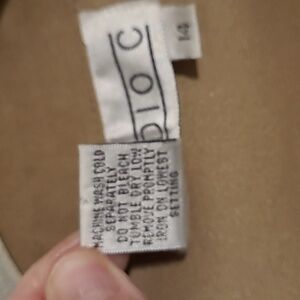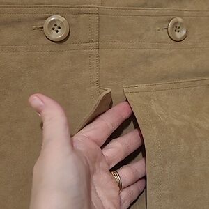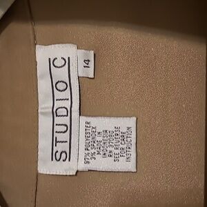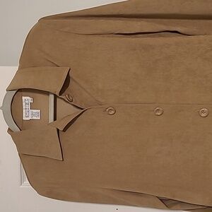 Studio C tan shacket size 14. Polyester/ spandex blend but has a suede feel.