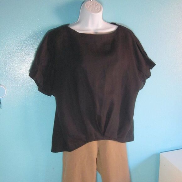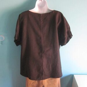 Black linen top has short dolman style sleeve, a high-low hem and pleated sleeve and back hemline.
