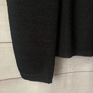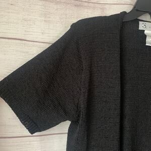 Black cardigan sweater by Studio Collection. This cardigan is made of a coarse knit material. It has a button up front that forms a small v-neckline when button. The short sleeves and the bottom are lined with a ribbed band. It is pre-owned and in great condition.