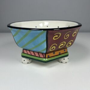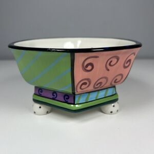 Studio Designworks 3 Footed Bowl Ceramic Polka Dots Swirls Stripes 6”. Absolutely beautiful condition. Reminds me of the Mad Hatter Tea party. Please see pictures for condition details and ask questions if you need to.