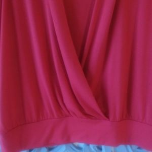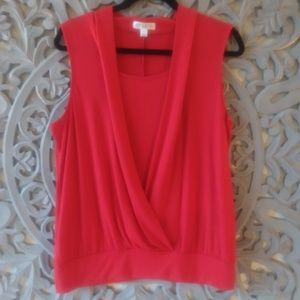 Studio size large sleeveless briight red draped and rouched stretchy shirt. Elastic stretch waist, gives the lenghtening line of a deep v-neck with the coverage of the scoop neck! Great layering piece.