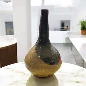 This Studio Drip Art Pottery Handmade Stoneware Bulbous Bud Vase stands at 7.75 inches tall and is signed by the artist. The vase features a style with a glossy finish, showcasing intricate hand-carved details and a textured design. Made from high-quality stoneware, this original piece is a unique addition to any art pottery collection, perfect for adding a touch of studio charm to any home décor setting. There was a furniture protective dot that the previous owner put on the name with a very heavy glue that I couldn’t take off for fear of ruining the name. I will include the dot for the buyer to place where they want.