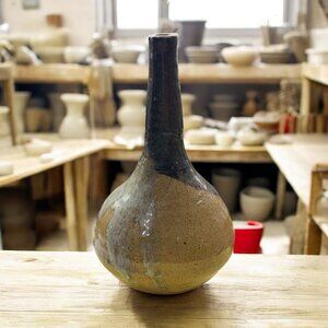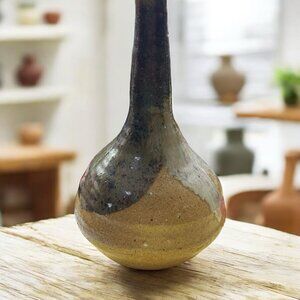 Studio Drip Art Pottery Handmade Stoneware Bulbous Bud Vase 7.75 in. Tall Signed