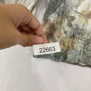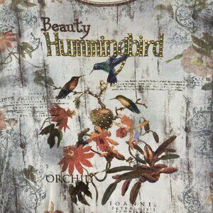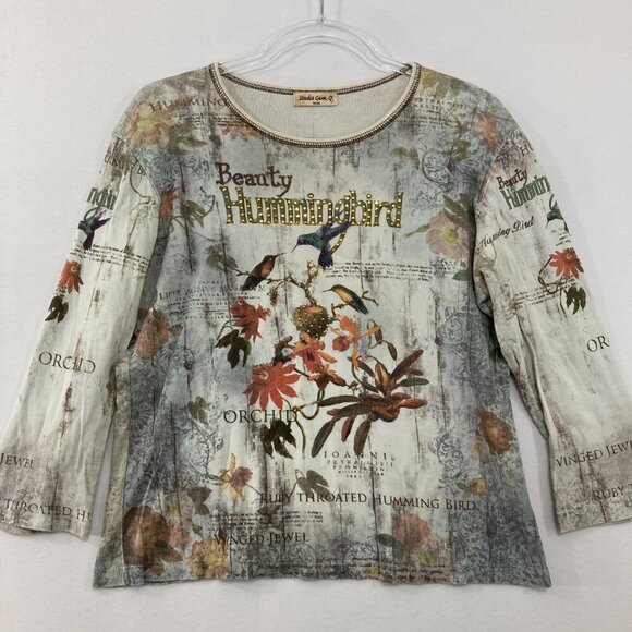 Studio Gem Q. Large Hummingbird Stretch Knit Crew Neck 3/4 Sleeve Artsy Boho Top