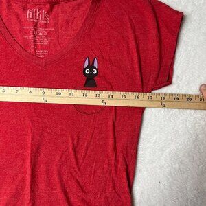 Jiji was such a faithful companion to Kiki and helped her through her witch training, and now he's ready to hang out with you! The heathered red V-neck features a print of Jiji hanging out near your heart in your shirt pocket - the perfect place for him!