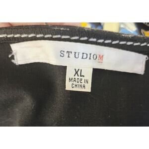 In good condition. The Studio M Black Space Dye tunic is a stylish and versatile top perfect for any casual or laid-back outfit. Featuring a unique space-dye pattern, three-fourth sleeves, and front patch pockets, this t-shirt is both comfortable and fashionable. Made from a blend of polyester, rayon, and spandex, it offers a regular fit and is designed for women in size XL. With its pullover closure and casual sleeve type, this tunic from StudioM is a must-have for any fashionable female wardrobe.