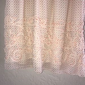 Studio M dress in sheer cream with coral and red polka dots and delicate detail at the hem and neckline. This dress is so pretty! The hanger does it no justice. It's 33" in length from the neckline to the hem so it falls at the knee, if not slightly above for us taller girls. The bust measures 19" flat and the waist has elastic in it for a comfortable fit. It's made of 100% polyester. Perfect for a wine tasting picnic, work, or as an every day summer dress! Looks good w maroon and boots.