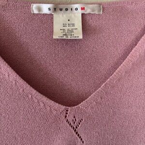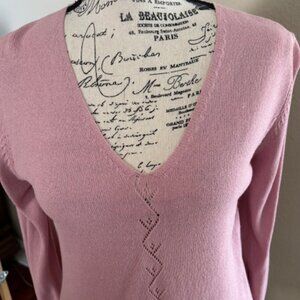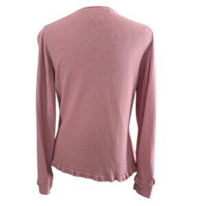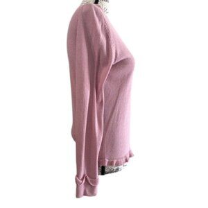 Lightweight knit pullover sweater with ruffled hem and cuffs. Very gently loved; in wonderful condition - no apparent signs of wear. Has decorative open weave in the front; has v-neck and is stretchy. Top is light pink.