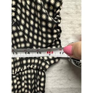Adorable Studio M babydoll-style dress with retro circle print and flirty details. ๐ค Cream polka dot pattern over a black base with ruffle accents and a flowy silhouette. Stretchy scoop neckline and flutter sleeves give it a whimsical, effortless vibe. Blue and black border at the hem adds an indie twist.