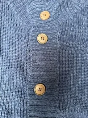 Thick knit cardigan with varied stitch details. Full button-front with wood-tone buttons. Ribbed high collar and cuffed sleeves. Cozy, structured fit for layering.