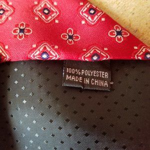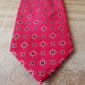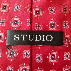 Studio neck tie. Red with navy blue and white designs and details..