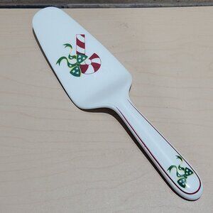 This is a white bone china server featuring a candy cane and bow design, part of the Peppermint Park Collection.