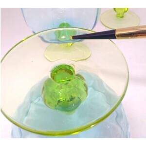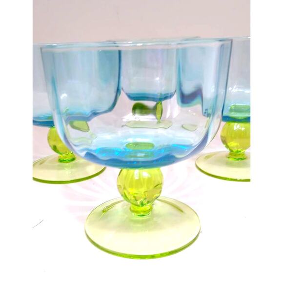 This is a set of four hand-blown blue and green stemmed glass dessert bowls by Studio Nova. There are air bubbles in them. One air bubble is on the rim of one of the bowls. They are 5" in height and 4.5" in diameter at the rim.