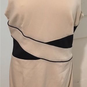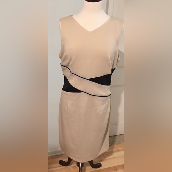 Knee length with zipper back closure Sleeveless Tan with black accents 5-3