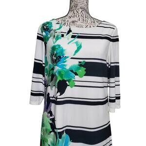 Studio One New York Cream & Black Striped Green Floral Print Midi Dress Medium