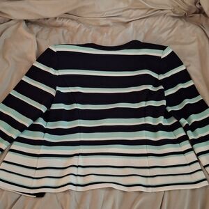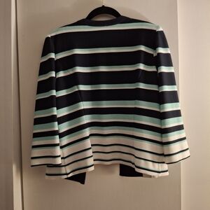Studio one New York women's striped open front jacket. Featuring a striking navy, white, and green pattern, it's perfect for any occasion. Size 12P. pit to pit measures 18 inches. Length 22 inches. Slightly padded shoulders.