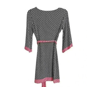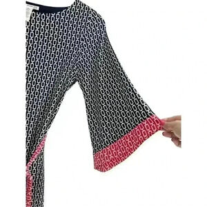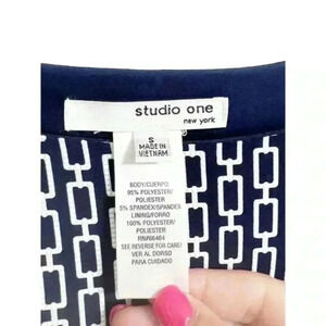 Studio One New York dress with dolman sleeves. Also has a tie belt. Can be worn with or without the belt. Size small. Navy blue, white, with red trim. The body is 95% polyester and 5% spandex. Lining is 100% polyester.