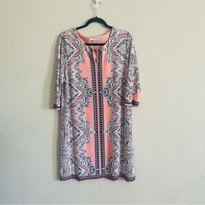 Elegant pink dress with intricate black and white patterns. Features a round neckline and three-quarter sleeves.