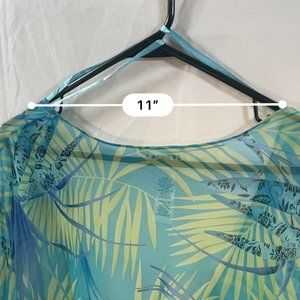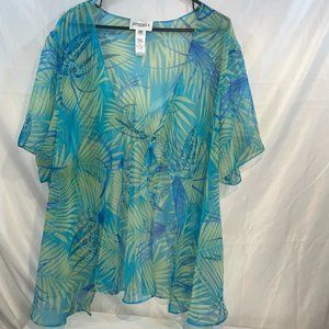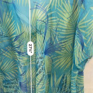 This is a beautiful spring and summer cover up for Camis. Great for the upcoming spring season. It has beautiful turquoise accent colors throughout the garment. Short sleeved.