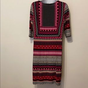 Beautiful and flattering shift dress from Studio One in excellent condition. Colors of black, pink, red, purple, white and beige. Elbow length sleeves. Pit to pit measurement is approx 19 inches. Top of shoulder seam to hem is approx 37 inches.