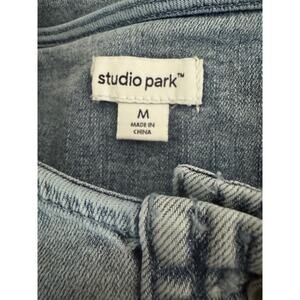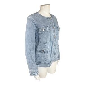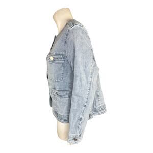 This item is a Studio Park X Amy Stran Denim Lady Jacket in the color Light Wash. It is a size Medium. This jacket is in NEW WITHOUT TAGS condition but is MISSING A BUTTON AS SHOWN.