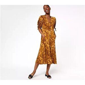 Features: border-print hem, removable belt, two-ply front bib with shirring, tassel detail, 3/4-length sleeve with elastic hem, side seam pockets, center-back seam, back-neck yoke, lightweight poplin lining