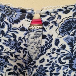 This beautiful top as soft cotton, navy and white with tiny white trim, and pretty button the the back. elbow length sleeves, slight swing style, bib front. size 3x