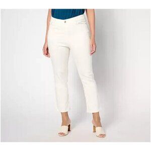 Hardware: zip fly and button closureFeatures: cropped, two front pockets, coin pocket, back patch pocketsRise: at the waistFit: semi-fitted; follows the lines of the body with added wearing easeLeg Shape: flared leg; flares from knee to leg openingInseam: missy/plus inseam 25"Content: 58% cotton/39% lyocell/3% spandexCare: machine wash, tumble dryImported
