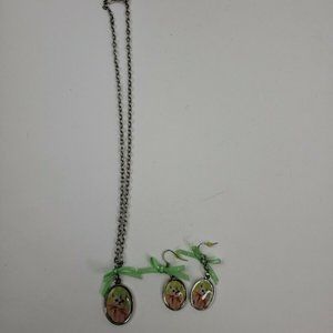 Beautiful set with a pair of dangle earrings and a necklace both with a cute ribbon detail.