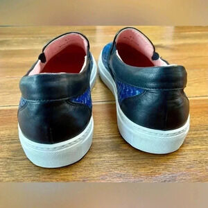 Pollini brand slip on sneaker. This pair features a navy leather weave upper with black accents, flex panel, light pink leather interior, pink soles and padded heel backs. Crisp white lowers in rubber for extra grip. Logo stamped treads.