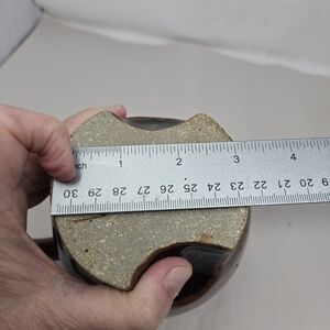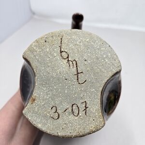This is a unique, handmade Studio Pottery Art Flower Vase with a handle. The vase is made of clay and ceramic materials with a glossy finish. It features a 2-color pattern in brown and black and is signed by the artist "BMT." The vase was produced in 2007 in the United States as part of the Studio Creations product line. It has a rustic style and is an original, licensed reproduction. The vase is 2 lbs in weight and has a height of 6 in. This vase is perfect for displaying flowers and adding a touch of pottery art to your home decor.