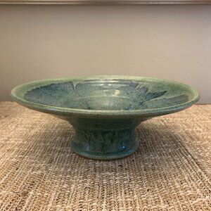 This is a preowned Studio Pottery Artist Signed Blue/Green Ikabana Vase with Kenza/Flower Frog. It has a beautiful blue green glaze. It is in excellent condition. It measures approximately 9.5" in diameter and stands approximately 3.5" tall.