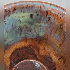 Studio Pottery Coffee Cup mug Beautiful colors blue brown green 3D Textured Large handle Signed by artist Not used Collectible