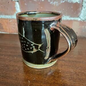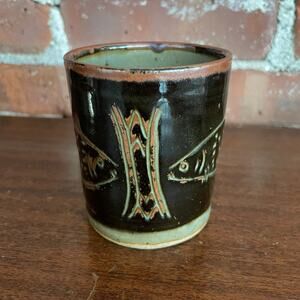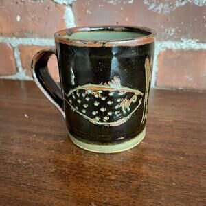This charming set of five studio pottery mugs features a hand-carved fish motif on each cup, offering rustic personality and artisanal craftsmanship. Earthy tones of deep brown, olive green, and rust are layered under a glossy glaze, with subtle variations that make each mug one-of-a-kind. Perfect for coastal kitchens, lake houses, or any home embracing a handmade aesthetic, these mugs are signed by the artist and built for everyday enjoyment.