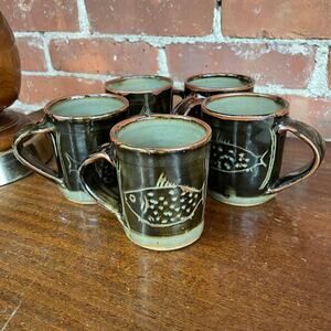 Studio Pottery Fish Mugs – Set of 5 Rustic Hand-Thrown Cups