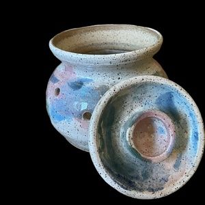 Studio Pottery Garlic Keeper Crock with Lid . Could also be used as a Tea Light Holder, Potpourri Holder, or Incense Holder. I am sure there are many other ways it could be used. It is Preowned in very Good Condition. It is signed and measures 4" T x 3.75" D. Any questions please ask. Thanks for looking.