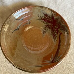 Studio Pottery Large Hand Thrown Bowl Tropical Palm Trees Bird Mixing Decor