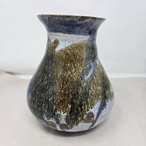 This is a handcrafted studio pottery vase signed by T. Gleason. The vase has a unique abstract pattern with earth tones of blue and brown. It has a decorative hand-painted backstamp. The vase is made of clay and has a pottery finish. The production style is art pottery, and the production technique is pottery. The vase is 5.5 inches long, 7 inches tall, and 3.5 inches wide, weighing 4 pounds.