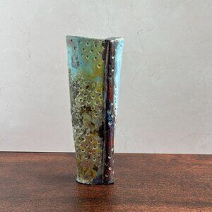 - Tall narrow vase with sculptural V-notch opening and irregular round base