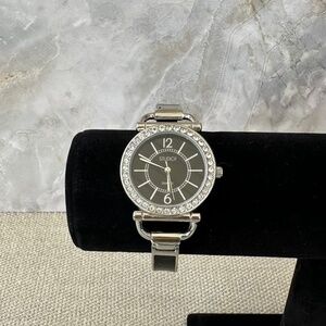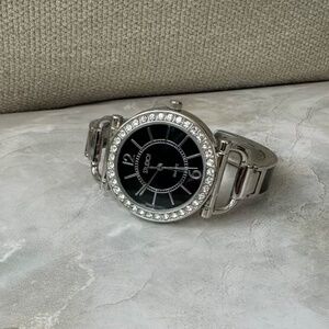 Add a touch of sparkle to your wrist with this stunning Studio Quartz Watch, featuring a sleek black dial and polished silver-tone finish. The bezel is adorned with brilliant crystal accents, adding just the right amount of glam to elevate both casual and dressy looks.