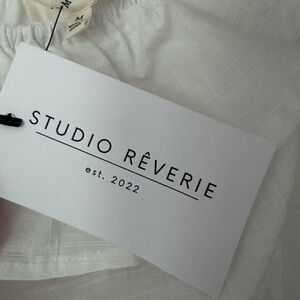 Studio Reverie white romper with ruffled off-shoulder design, elastic waist and pockets, local boutique/store, new w tags