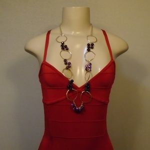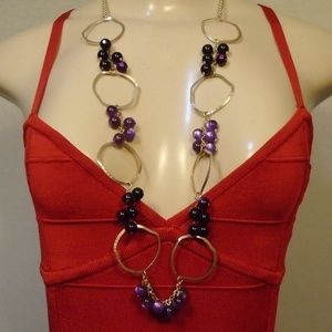 This necklace is from Studio Select, and was sold in higher end department stores. We have an exclusive collection of interesting and quality designed pieces from this label. Match up a super outfit or have this piece do all the talking. This Necklace features an extra long link chain with clusters of alternating purple acrylic beads. It is finished in polished gold plated metal. The item is brand new without the tags.