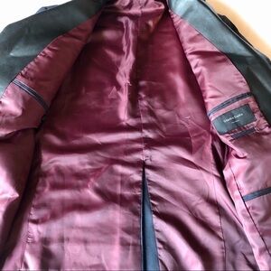Gorgeous burgundy liner. One button. Two front flap pockets and one open pocket at breast. No size, materials or care instructions labels. Measures as a M but please refer to measurements to ensure proper fit.